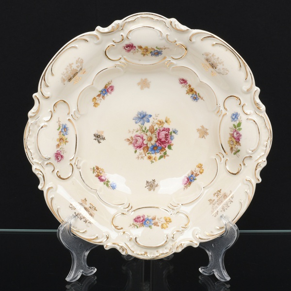 • Centro de mesa em porcelana Bavaria (Alemanha), corpo circular de borda recortada e ondulada, interior côncavo, com relevo moldado de inspiração rococó. Decoração em esmaltação policroma com arranjos florais distribuídos em reservas, centro com buquê floral, e realces em douração nos filetes e elementos em relevo. Marca na base em esmalte verde sob vidrado Bavaria  Made in Germany. Medidas: