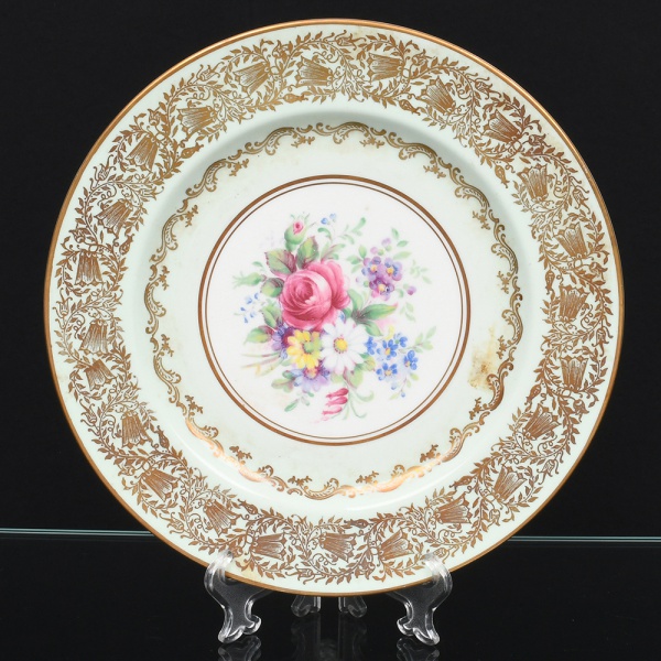 • Paragon China Company(antes Star China Company funda em 1897). Prato de serviço em faiança inglesa, formato circular com aba larga; campo central decorado com composição floral policromada, representando rosas e flores campestres, executada em pintura sob esmalte; aba ornada com friso contínuo em douração, composto por motivos fitomorfos estilizados e elementos ornamentais repetitivos; filetes dourados delimitando reservas concêntricas. Decoração realizada por transferência e acabamento manual em douração. Marca da manufatura no verso. Medida: Diam.: