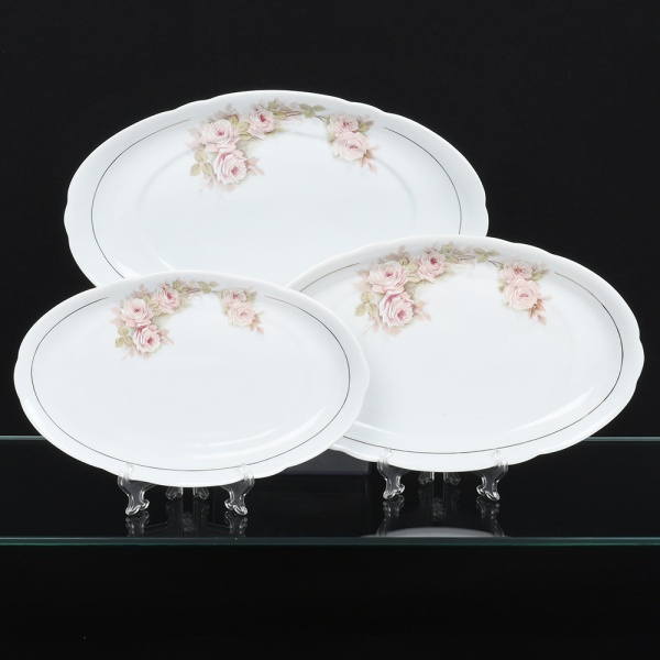 • Porcelana Real, Mauá - SP(Fundada em 1943 por Fritz Erwin Schmidt). Três(03) travessa ovais em porcelana nacional, esmaltação na cor branca, decoração com arranjos florais em tonalidades suaves de rosa, acompanhadas por folhas em verde claro, dispostos lateralmente na aba, complementado por filetes dourados finos aplicados próximos à borda e na linha interna da aba. Marca da manufatura no verso. Medidas: Comp.: x Larg.: ; Comp.: x Larg.: ; Comp.: x Larg.: