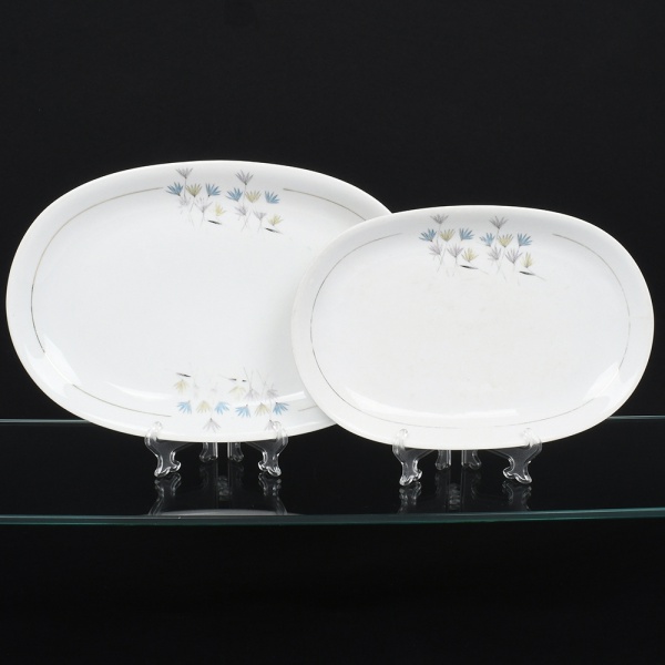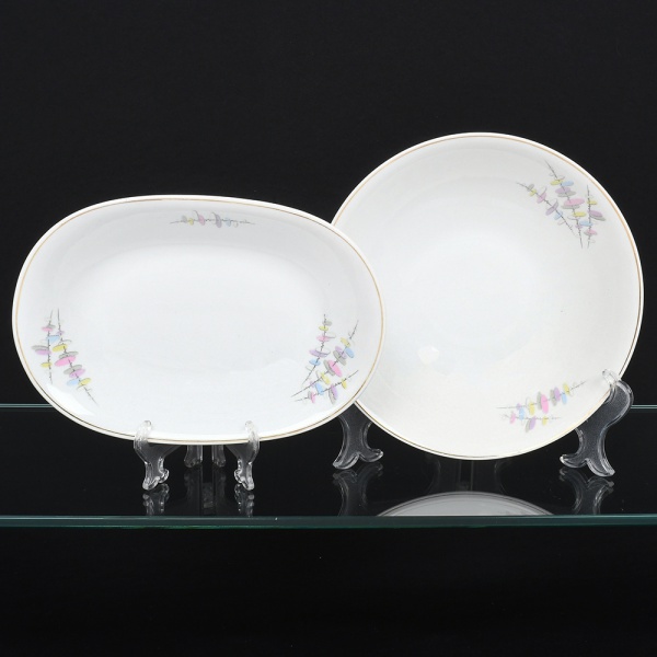 • Porcelana Renner, Porto Alegre - RS(Fundada em 1937). Duas(02) travessa ovais em porcelana nacional, esmaltagem vítrea na cor branca, decorado com flores estilizadas em estampagem policromada, orla delimitada por friso em douradura. Medidas: Comp.: x Larg.: ; Comp.: x Larg.: