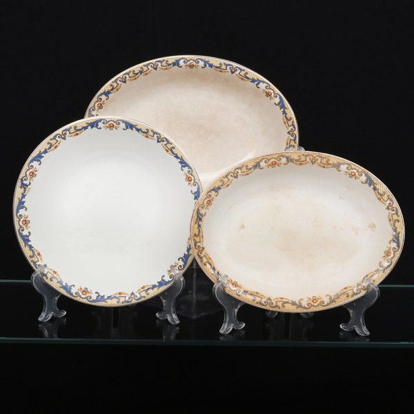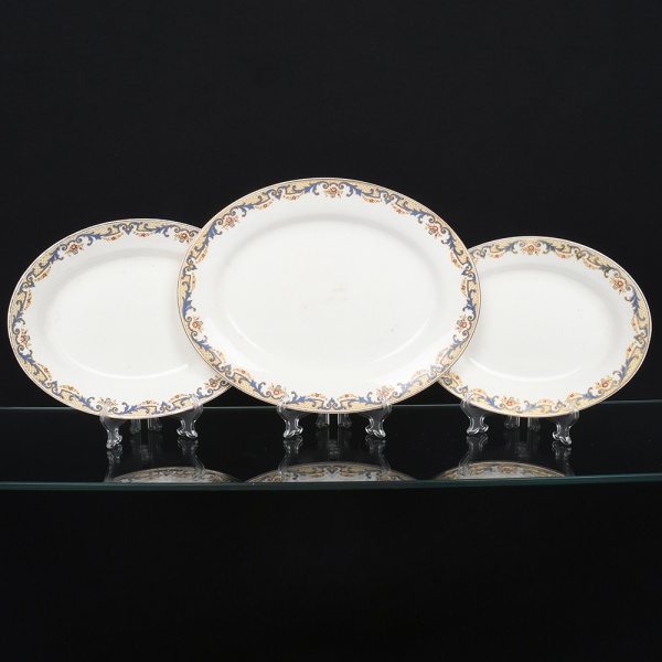 • J & G Meakin, Staffordshire - Inglaterra(Fundada em 1851). Três(03) travessas ovais em faiança inglesa da década de 1930/40, padrão "SOL"; esmaltação de tom marfim, dotado de rica decoração policromada formada por arabescos vegetalistas estilizados e padrão floral, em composição contínua ao redor da orla, predominando as tonalidades ocre, amarelo, dourado, azul e vermelho, borda contornada por friso em douradura. Marca da manufatura no verso. Medidas: Comp.: x Larg.: ; Comp.: x Larg.: ; Comp.: x Larg.: