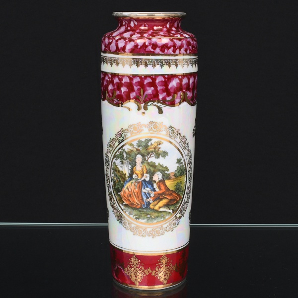• Vaso em porcelana nacional da década de 1950/60, corpo cilíndrico alongado, com borda levemente evertida. Decoração em esmaltação policroma e douração, apresentando cena galante de inspiração rococó em reserva central, circundada por frisos ornamentais. Faixas superiores e inferiores em tom rubi marmorizado com detalhes em ouro. Verso com motivos florais estilizados esparsos. Marca da manufatura ao fundo. Medidas: