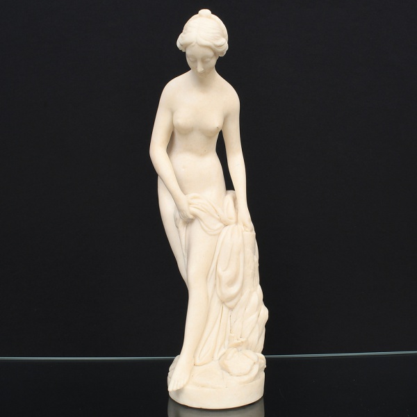 • Escultura executada em marmolina moldada, representando Vênus, inspirada no modelo Vênus saindo do banho (La Baigneuse), de tradição neoclássica francesa, com referência a composições de Étienne-Maurice Falconet. Figura em posição sinuosa, com inclinação da cabeça e olhar voltado para baixo, segurando panejamento junto ao corpo. Tratamento anatômico com modelagem contínua e superfície fosca. Base circular integrada com elementos naturalistas em relevo. Medidas: