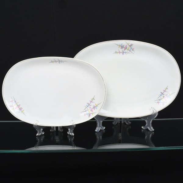• Porcelana Renner, Porto Alegre - RS(Fundada em 1937). Duas(02) travessas ovais em porcelana nacional, esmaltagem vítrea na cor branca, decorado com flores estilizadas em estampagem policromada, orla delimitada por friso em douradura. Medidas: Comp.: x Larg.: ; Comp.: x Larg.: