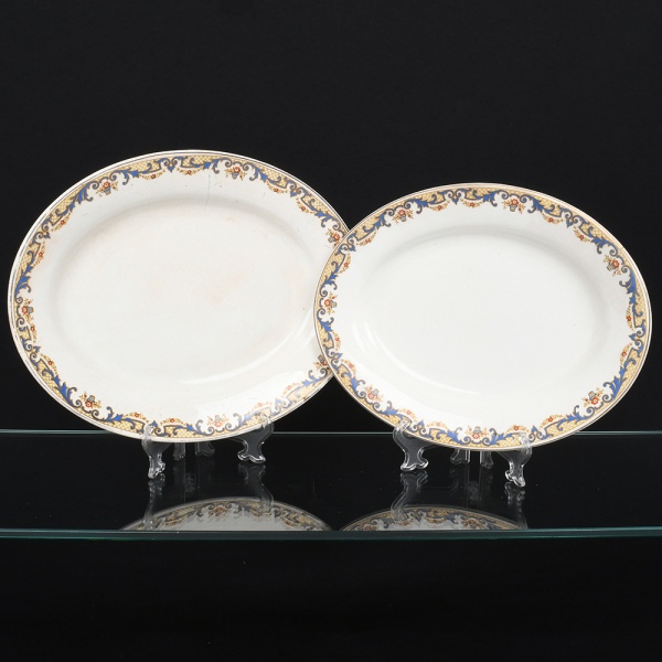 • J & G Meakin, Staffordshire - Inglaterra(Fundada em 1851). Duas(02) travessas ovais em faiança inglesa da década de 1930/40, padrão "SOL"; esmaltação de tom marfim, dotado de rica decoração policromada formada por arabescos vegetalistas estilizados e padrão floral, em composição contínua ao redor da orla, predominando as tonalidades ocre, amarelo, dourado, azul e vermelho, borda contornada por friso em douradura. Marca da manufatura no verso. Medidas: Comp.: x Larg.: ; Comp.: x Larg.: ;