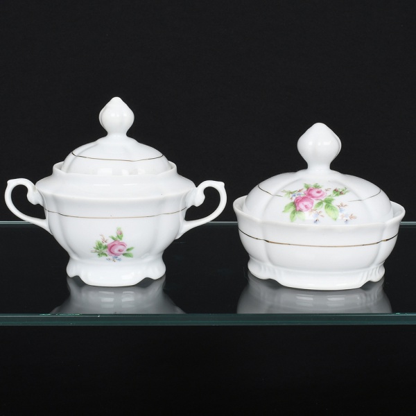 • Porcelana Real, Mauá - SP(Fundada em 1943 por Fritz Erwin Schmidt). Um(01) açucareiro e uma(01) manteigueira em porcelana nacional, esmaltação branca modelada com gomos em relevo; corpo bojudo decorado com composição floral em estampagem policromada, predominando as tonalidades rosa e verde, bordas e contornos realçados com friso em douradura, alças laterais em voluta e pega da tampa ovoide. Marca da manufatura ao fundo. Medidas: