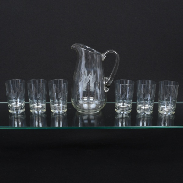 • Conjunto em cristal diáfano e incolor, composto por uma(01) jarra e seis(06) copos. Jarra com corpo de perfil balaústre, bico vertedor pronunciado e alça lateral curvada aplicada sobre a superfície, copos de formato cilíndrico com base espessa, talhados com motivos geométricos estilizados em repetição vertical. Medidas: