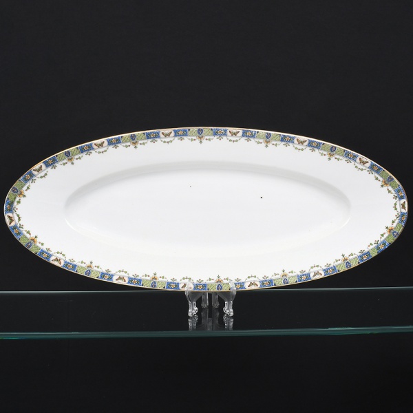 • Andrieux & Co. Limoges, Limoges - França. Travessa oval executada em porcelana francesa, da região de Limoges; esmaltação branca, centro ligeiramene rebaixado, borda decorada com friso policromo composto por cartelas geométricas azuis e verdes alternadas, intercaladas por pequenos medalhões com borboletas, além de motivos florais estilizados e grinaldas vegetalistas delicadas dispostas ao longo da aba. Marca da manufatura no verso. Medidas: Comp.: 49 x Larg.: 20 cm.