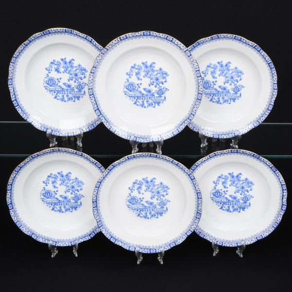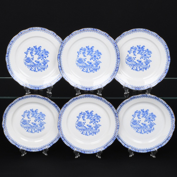 • ROSSLAU - ALEMANHA. Exuberante conjunto de pratos rasos em porcelana alemã, de contorno recortado com aba larga levemente ondulada. Esmaltação branca, decoração apresenta composição em azul padrão china-blau, característica da tradição decorativa centro-europeia inspirada nas porcelanas orientais; aba ornada por friso contínuo em azul com motivos florais estilizados e elementos geométricos, delimitado por filete dourado acompanhando o contorno ondulado da borda, campo central apresenta vinheta decorativa em azul, composta por padrão de flores, ânfora e elementos arquitetônicos. Marca no verso em azul: CHINA-BLAU / ROSSLAU, indicando manufatura da fábrica Rosslau, Alemanha. Composto de seis(06) unidades. Medida: Diam.: 24 cm.