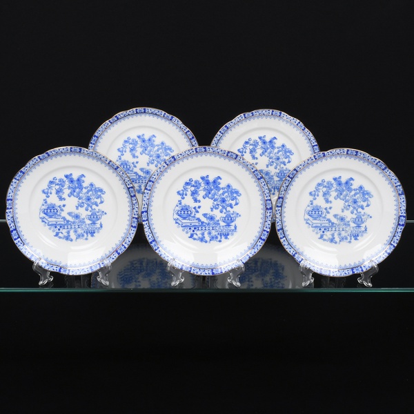 • ROSSLAU - ALEMANHA. Exuberante conjunto de pratos para sobremesa em porcelana alemã, de contorno recortado com aba larga levemente ondulada. Esmaltação branca, decoração apresenta composição em azul padrão china-blau, característica da tradição decorativa centro-europeia inspirada nas porcelanas orientais; aba ornada por friso contínuo em azul com motivos florais estilizados e elementos geométricos, delimitado por filete dourado acompanhando o contorno ondulado da borda, campo central apresenta vinheta decorativa em azul, composta por padrão de flores, ânfora e elementos arquitetônicos. Marca no verso em azul: CHINA-BLAU / ROSSLAU, indicando manufatura da fábrica Rosslau, Alemanha. Composto de cinco(05) unidades. Medida: Diam.: 19,5 cm.