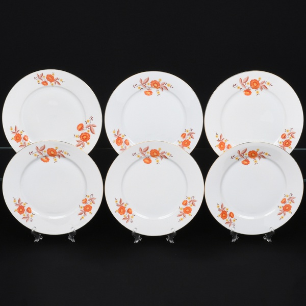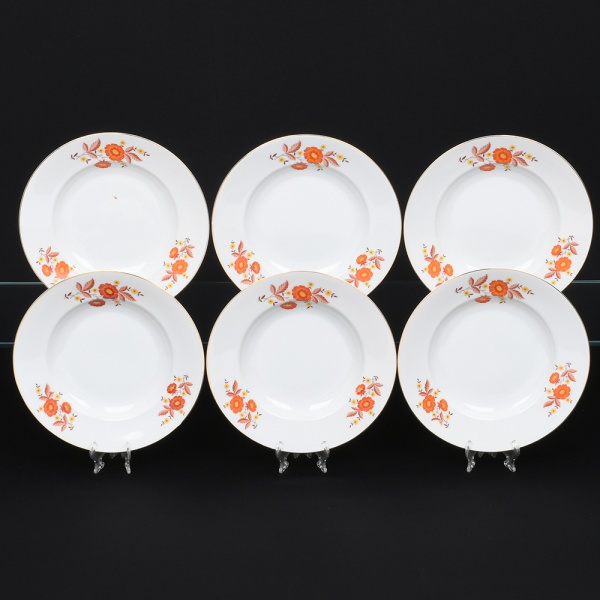 • Porcelana Renner, Porto Alegre - RS(Fundada em 1937). Conjunto de pratos rasos em porcelana nacional, esmaltagem vítrea na cor branca, decorado com flores estilizadas em estampagem policromada, orla delimitada por friso em douradura. Composto de seis(06) unidades. Medidas: Diam.: 22,5 cm.
