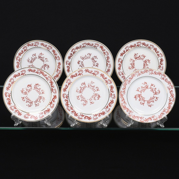 • Porcelana Rio Branco/Cia. Brasileira de Vidros, Rio de Janeiro - RJ(Fundada em 1947, ativa até 1967). Elegante conjunto de pratos para pão, ou doce, em porcelana nacional da década de 1950/50;  esmaltagem vítrea na cor branca, decoração em esmalte vermelho-coral, formada por arabescos e ramos vegetalistas estilizados, dispostas ao redor da orla e ao centro, realçada com filetes em douradura. Marca da manufatura no verso. Composto de cinco(06) unidades. Medida: Diam.: 16 cm.