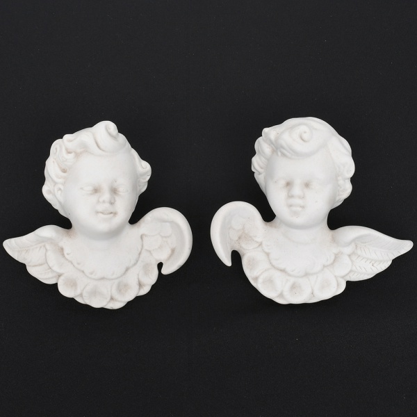 • Par de esculturas decorativas em porcelana de biscuit, tonalidade branca, representando querubins alados modelados em busto, apresentam rosto infantil de feições suaves, cabelos ondulados e asas abertas, com tratamento escultórico em relevo que destaca os cachos do cabelo, as penas das asas e o drapeado estilizado na base do busto, parte posterior dotado de orifício circular para fixação em parede. Medidas: Alt.: 11,5 x Comp.: 12,5 x Larg.: 6 cm.