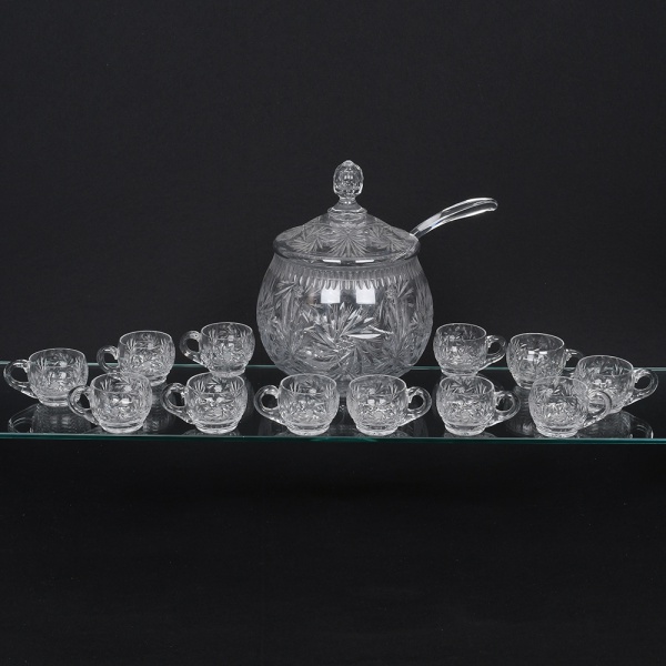 • Conjunto de poncheira em cristal incolor lapidado, composto por recipiente central com tampa e colher de servir, acompanhado por doze(12) xícaras com alça, destinado ao serviço de ponche ou bebidas frias; corpo globular com tampa encaixada e pomo facetado, decorado com lapidação profunda composta por estrelas, raios e facetas distribuídas ao longo da superfície, colher possui cabo curvo em cristal transparente, adaptado para o serviço da bebida, xícaras apresentam forma arredondada alça circular, igualmente ornamentadas com motivos lapidados em padrão estrelado e raiado, criando efeitos de brilho e refração da luz. Medidas: Poncheira: Alt.: 31,5 x Diam.: 24,5 cm; Concha: Comp.: 37 cm; Caneca: Alt.: 6 x Comp.: 11 x Larg.: 7,5 cm. Canecas apresentam pequenos bicados na borda. Borda da poncheira com um ínfimo bicado.