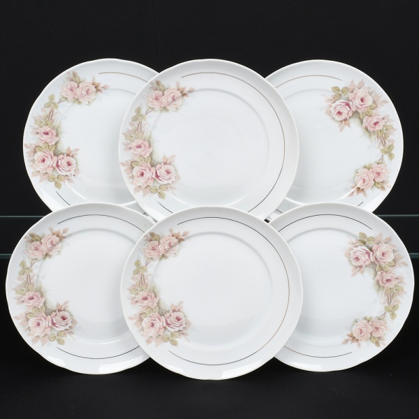 • Porcelana Real, Mauá - SP(Fundada em 1943 por Fritz Erwin Schmidt). Conjunto de pratos rasos em porcelana nacional, esmaltação na cor branca, decoração com arranjos florais em tonalidades suaves de rosa, acompanhadas por folhas em verde claro, dispostos lateralmente na aba, complementado por filetes dourados finos aplicados próximos à borda e na linha interna da aba. Marca da manufatura no verso. Composto de seis(06) unidades. Medida: Diam.: