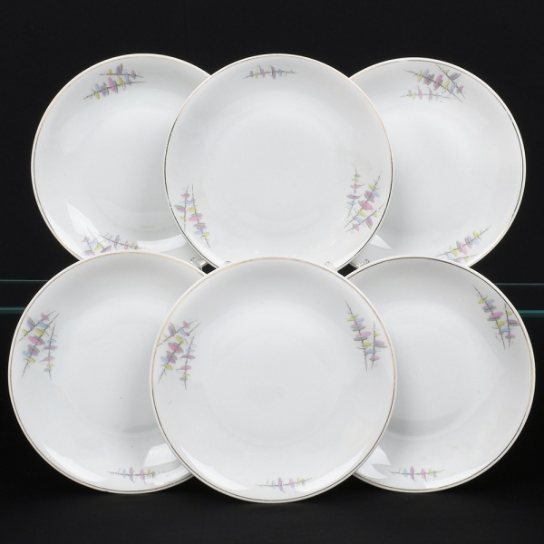 • Jean Haviland, Limoges - França. Belíssima conjunto de pratos fundos executado em porcelana francesa da década de 1950/60; caldeira funda, esmaltagem vítrea na cor branca, decoração em estampagem policromada, composta por ramagens florais estilizadas distribuídas assimetricamente na aba, predominando as tonalidades coral, marsala e amarelo, borda contornada por friso em douradura. Marca da manufatura no verso. Composto de seis(06) unidades. Medida: Diam.: 25 cm.