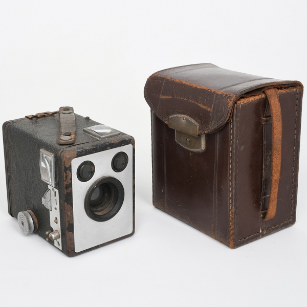 • Câmera fotográfica tipo box Six-20 Brownie Model E, fabricada pela Kodak Limited, Londres, Inglaterra, c. década de 1930, acompanhada de estojo original em couro e material impresso de instruções. Câmera fotográfica portátil de corpo retangular, construída em estrutura metálica revestida externamente por material sintético texturizado; face frontal apresenta placa metálica com lente central fixa, acompanhada por duas pequenas janelas ópticas destinadas ao sistema de visor, parte superior com visor adicional e alça de transporte em couro fixada por rebites metálicos, conjunto ótico composto por lente simples de foco fixo, característica das câmeras populares da série Brownie, associada a obturador mecânico de acionamento manual, lateral dotado de botão de avanço do filme, parte posterior possui janela circular com filtro vermelho, destinada à visualização da numeração do filme durante o transporte do rolo; interior da câmera abriga compartimento para filme fotográfico formato 620, sistema amplamente utilizado pela Kodak nas câmeras box da primeira metade do século XX. Acompanha estojo original em couro rígido com fecho metálico, folhetos e material de instruções da Kodak, incluindo manual intitulado How to use your Six-20 Brownie Model E. Estado de conservação conforme fotografias, presenta marcas de uso, desgaste do revestimento externo, oxidação superficial em partes metálicas e envelhecimento natural do estojo de couro, mantendo contudo sua estrutura completa, com componentes principais preservados e acompanhada de material impresso original. Não foi testada, sem garantias de funcionamento. Medidas: Alt.: 10 x Comp.: 12 x Larg.: 8 cm.
