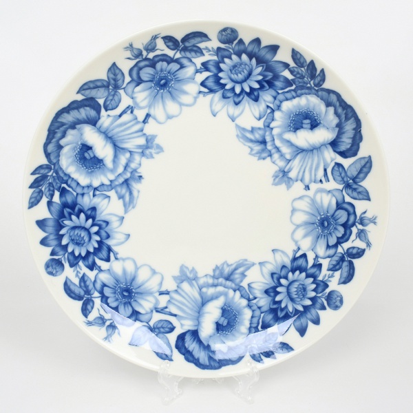 • KPM - Königliche PorzellanManufaktur Berlin - Alemanha(Fundada em 1763 por Frederico, o Grande). Prato medalhão de coleção em porcelana alemã, esmaltação vítrea de tom marfim, decoração composta por flores estilizadas, folhas e botões dispostos em composição circular ao longo da aba, executados em tonalidades graduadas de azul cobalto. Marca da manufatura no verso. Medida: Diam.: 32 cm.