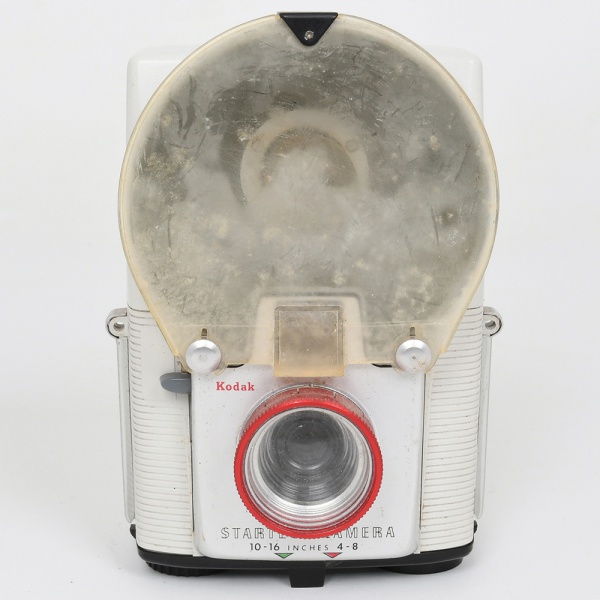 • Câmera fotográfica infantil Kodak Startech Camera com flash integrado, fabricada pela Eastman Kodak Company, Estados Unidos, c. década de 1950. Câmera fotográfica do tipo box camera destinada ao público infantil, confeccionada em corpo de material plástico moldado na cor branca com base inferior em material sintético preto. O modelo apresenta flash incorporado em refletor metálico superior, protegido por difusor plástico translúcido removível, destinado à dispersão uniforme da luz durante a exposição. A parte frontal exibe inscrição Kodak e denominação Startech Camera, com indicação de distâncias de foco 48 inches e 1016 inches, correspondentes a fotografias de curta distância, característica comum em câmeras destinadas a uso recreativo infantil. O conjunto ótico é composto por lente simples fixa com aro frontal em plástico vermelho, associada a visor óptico superior. O compartimento posterior abriga mecanismo para filme fotográfico em rolo, com carretel removível e sistema manual de avanço do filme. Na parte traseira encontra-se etiqueta do distribuidor Lester A. Dine Inc., New Hyde Park, Long Island, New York, empresa conhecida pela distribuição de equipamentos fotográficos e didáticos nos Estados Unidos. Estado conforme fotografias, com marcas de uso, pequena avarias e perdas. Não foi testada, sem garantias de funcionamento. Medidas: Alt.: 13,5 x Comp.: 9 x Larg.: 6 cm.
