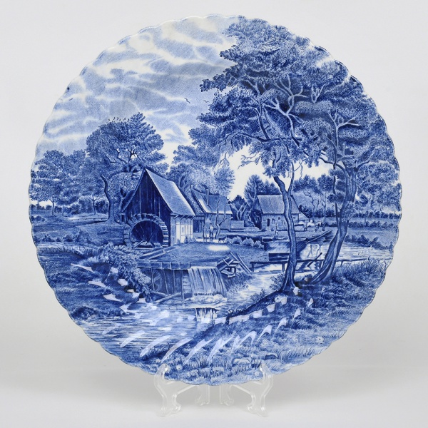 • Johnson Brothers, Staffordshire - Inglaterra(Fundada em 1883). Grande prato de coleção executado em faiança inglesa, padrão Watermill. Decoração monocromática em azul sob esmalte, representando paisagem rural com moinho hidráulico, executada por estampagem. A composição mostra edifício de moinho com roda dágua em funcionamento, pequeno dique e queda dágua, acompanhados por casas campestres, árvores frondosas, figuras humanas em ambiente bucólico e céu anuviado ao fundo; orla modelada com delicado movimento ondulado, borda recortada com arcos em repetição. Marca da manufatura no verso. Medida: Diam.: 31 cm.