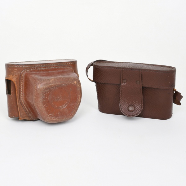 • Dois(02) estojos para câmera fotográfica em couro marrom, estrutura reforçada e costura aparente, um com tampa articulada, moldada para acomodar câmera do tipo box, trazendo na parte frontal marca em relevo Kodak inserida em cartela oval, possui fecho por pressão e presilhas metálicas inferiores destinadas à fixação da câmera no interior do estojo, o outro estojo apresenta formato retangular, com tampa superior e aba frontal de fechamento por botão de pressão, acompanhado de alça lateral para transporte, dotado de rosca metálica na base para fixação para tripé, além de inscrição em relevo Made in Germany, indicando origem de fabricação. Estado conforme fotografias, apresentam marcas de uso, vide foto. Medidas: Alt.: 10 x Comp.: 14 x Larg.: 10 cm; Alt.: 10,5 x Comp.: 15 x Larg.: 4 cm.