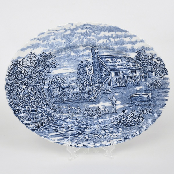 • Wood & Sons, Burslem - Inglaterra(Fundada em 1865). Excepcional travessa oval executada em faiança inglesa, decorada com estampagem em monocromia azul, série 'The Post House'. A cena central representa uma diligência puxada por quatro cavalos em frente a uma estalagem rural de arquitetura tradicional, onde se reúnem viajantes e personagens em diferentes atividades, identificada por placa com a inscrição Red Lion. Em segundo plano, observam-se árvores frondosas, construções de apoio, e céu anuviado ao fundo compondo paisagem campestre; borda suavemente recortada e moldada em delicado movimento ondulado, acompanhando o enquadramento da decoração. Marca da manufatura no verso. Med.: Comp. 35 x Larg. 27,5 cm.