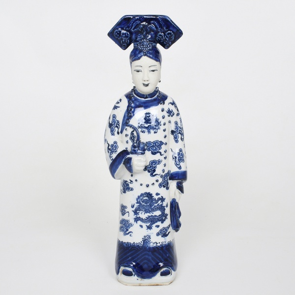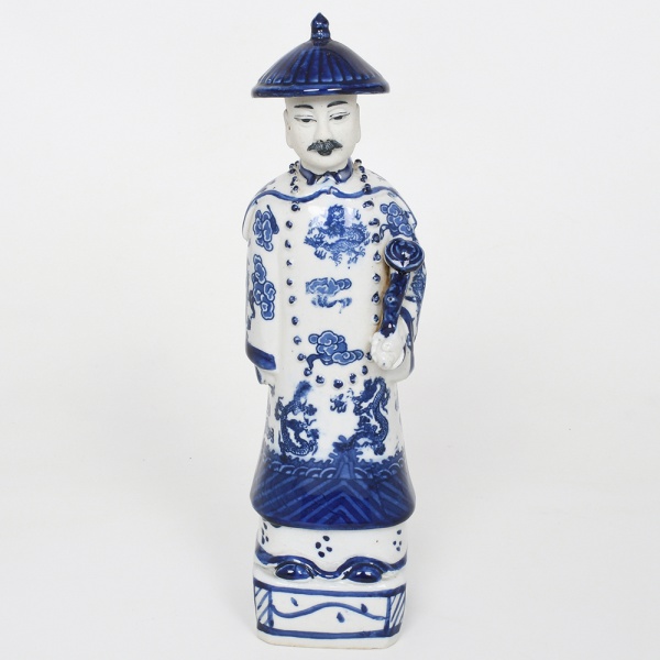 • Escultura em porcelana "blue and white" representando funcionário ou dignitário da administração imperial chinesa (mandarim), figurado em posição frontal, trajando longa veste cerimonial ricamente decorada com dragões imperiais e nuvens auspiciosas em esmalte azul sob vidrado, apresenta modelagem escultórica com aplicações em relevo simulando botões e ornamentos da vestimenta; personagem porta chapéu cônico de oficial, característico da iconografia burocrática chinesa, e segura acessório cerimonial junto ao corpo, possivelmente relacionado à simbologia do status administrativo. Na parte posterior observa-se a longa trança (queue), penteado tradicional imposto durante a dinastia Qing aos oficiais e súditos do império.Base quadrangular com marca moldada em relevo com caracteres chineses (Da Qing Qianlong Nian Zhi), traduzível como Feito durante o reinado de Qianlong da Grande Dinastia Qing, referência honorífica ao imperador Qianlong Emperor, governante da Qing dynasty. Tal inscrição corresponde a marca honorífica amplamente reproduzida em porcelanas chinesas decorativas posteriores, não indicando necessariamente produção do período original. Medidas: Alt.: 29 x Comp.: 8 x Larg.: 7,5 cm.