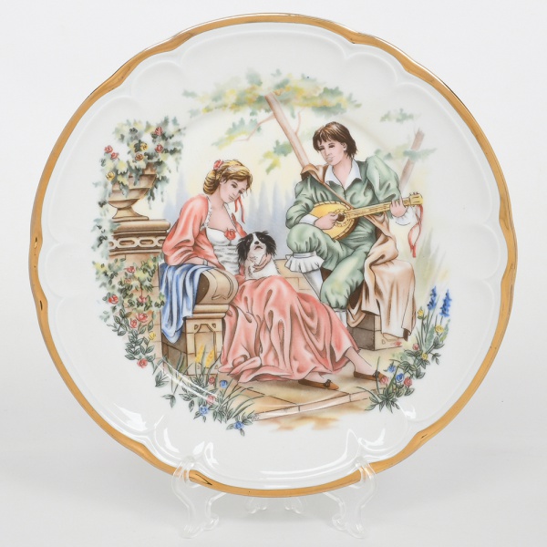 • Prato de coleção em porcelana francesa, manufatura de Limoges, borda recortada em contorno ondulado e aba larga. Decoração policroma em esmaltes sobre vidrado, com filete dourado contínuo na orla. Campo central com cena galante em policromia, representando casal em ambiente ajardinado, com figura feminina sentada ao lado de cão de colo e figura masculina tocando instrumento de cordas. Elementos arquitetônicos e vegetação ao fundo. Verso com marca em azul sob esmalte com inscrição Limoges  Décoration à la main. Medida: Diam.: