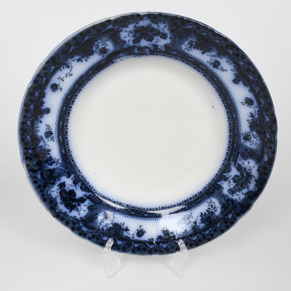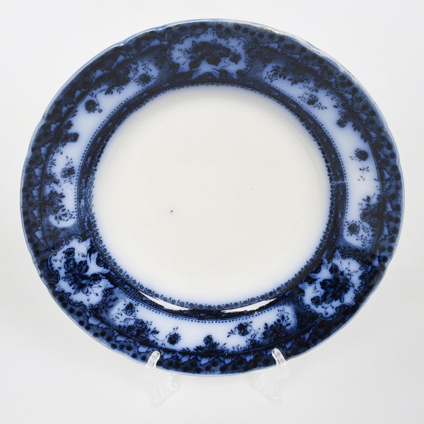 • Fábrica de Loiça de Sacavém (Gilman & C.ª), Sacavém, Portugal. Manufatura fundada em 1850 por John Stott Howorth e posteriormente administrada por William Gilman, com produção de faiança fina e grés, adotando processos industriais de moldagem e decoração por estampagem. Belíssimo prato raso em faiança portuguesa, com aba larga e borda recortada. Dotada de decoração obtida por transferência(transfer printing) em monocromia azul cobalto, aplicada sob o vidrado (underglaze), apresentando motivos vegetalistas em reservas e cartelas distribuídas na aba e friso interno contínuo. Marca sob a base em azul: BEIRA / GILMAN & C.ª / SACAVÉM / PORTUGAL. Medida: Diam.: 25 cm.