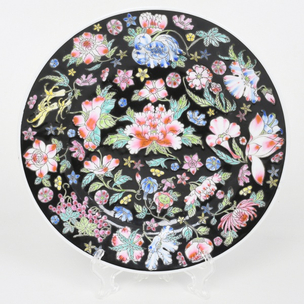 • Belíssimo prato em porcelana chinesa, decoração botânica em esmalte policromado e relevado, distribuído sobre fundo de tonalidade preta. Marca da manufatura e inscrição "MADE IN CHINA" no verso. Medida: Diam.: 23 cm.