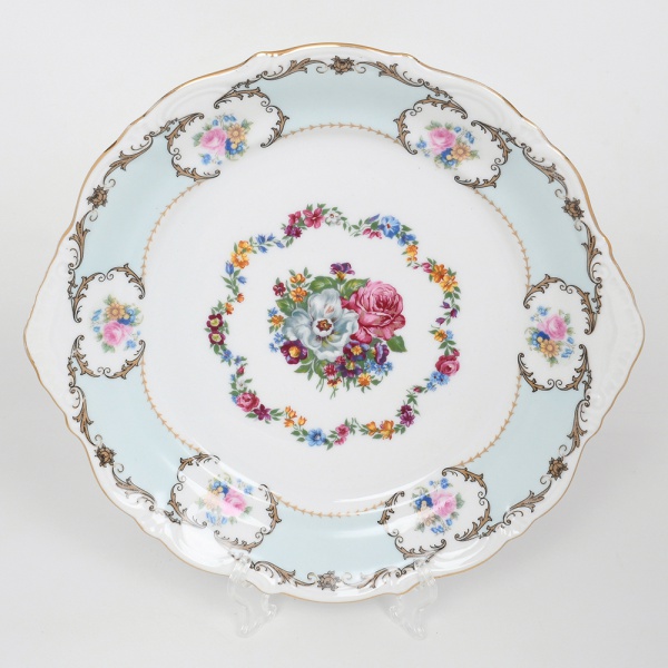 • VIZAVI. Grande prato para serviço em porcelana, esmaltação branca parcialmente preenchida por faixa de tonalidade azul claro, dotado de rica decoração com flores e elementos vegetalistas em estampagem policromada, bordo recortado contornado com filete em douradura, relevado com volutas e conchas, alças laterais integradas. Marca da manufatura no verso(sobreposição). Medidas: Comp.: 28 x Larg.: 26 cm.