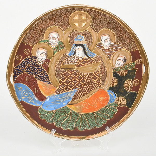• Prato circular em cerâmica japonesa com decoração policroma, aplicação de moriage em relevo, realces em ouro e filete na borda, dotada de pequenas alças integradas; face frontal apresenta composição figurativa formada por uma figura central sentada, acompanhada por quatro Imortais (sennin/rakan), representados como anciãos em trajes tradicionais, tema recorrente em produções de exportação em estilo Satsuma. O fundo do campo decorativo é preenchido por padrão de ondas, com áreas delimitadas por contornos dourados. A iconografia e a técnica de moriage situam a peça dentro da produção japonesa voltada ao mercado externo entre o final do período Taish e o início do período Showa. Apresenta craquelado característico do material acentuado pelo tempo, e dois fios no verso da borda. Medida: Diam.: 24,5 cm.