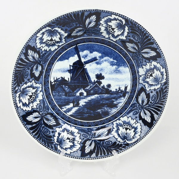 • Boch Frères Keramis (posteriormente Royal Boch), La Louvière - Bélgica(Fundada em 1841 por Jean-François Boch). Prato de coleção em faiança esmaltada, de formato circular com aba larga e cavidade rasa, decorado na técnica de transferência (transferware) em azul sobre fundo branco; cena central apresenta paisagem rural de inspiração holandesa, com moinho de vento, casa, curso dágua e fundo com céu anuviado, em composição monocromática pontilhada, orla circundada por faixa contínua com motivos florais estilizados e elementos vegetalistas, organizados em repetição, delimitados por frisos concêntricos. Verso com marca impressa contendo inscrição BOCH Belgium, acompanhada de elemento heráldico. Medida: Diam.: 23,5 cm.