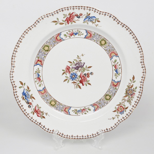 • SPODE, Stoke-on-Trent - Inglaterra(fundada por Josiah Spode em 1770). Raro prato de coleção em faiança inglesa, esmaltação branca, decoração em esmaltes sobre vidrado, com composição floral policroma no campo central. Aba com faixa ornamental contínua em padrão repetitivo de elementos florais e volutas, intercalada por reservas com pequenos arranjos florais. Orla com friso linear em marrom. Verso com marca em marrom sob esmalte com inscrição Spode Copeland England e numeração. Medida: Diam.:
