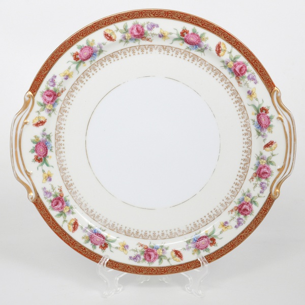 • NORITAKE, Nagoya - Japão(Fundada em 1904 pelos irmãos Ichizaemon e Toyo Morimura). Exuberante travessa circular executada em porcelana japonesa, esmaltagem vítrea na cor branca, orla circundadas por buquês de flores em estampagem policromada sobre fundo levemente em tom marfim, dotada de profusa ornamentação em douradura, com frisos, arabescos, e elementos vegetalistas sobrepondo faixa de tonalidade bordô contornando a borda, abas laterais proeminentes, recortadas e terminadas em volutas. Marca da manufatura ao fundo. Med.: Diam. 27,5 cm. Apresenta desgastes parciais na douradura.