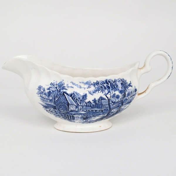 • Molheira em faiança inglesa decorada em azul sob esmalte, provavelmente Staffordshire, final do século XIX ou início do século XX; esmaltação na cor branca, bojo alongado, decorado com frisos ondulados modelados na própria pasta, apoiado sobre pequeno pedestal oval, bico vertedor pronunciado e alça lateral em voluta, borda superior recortada, corpo ornamentado em técnica de transfer printing em azul monocromático, representando paisagem campestre com construções rurais, moinho, árvores e figuras humanas em cenário bucólico. Base com numeração em relevo de fábrica. Decoração integra a tradição inglesa conhecida como blue transferware, amplamente produzida na região de Staffordshire, importante centro cerâmico da United Kingdom durante o período vitoriano. Apresenta manchas do tempo, e craquelado característico do material. Medidas: Alt.: 9,5 x Comp.: 21,5 x Larg.: 10 cm.