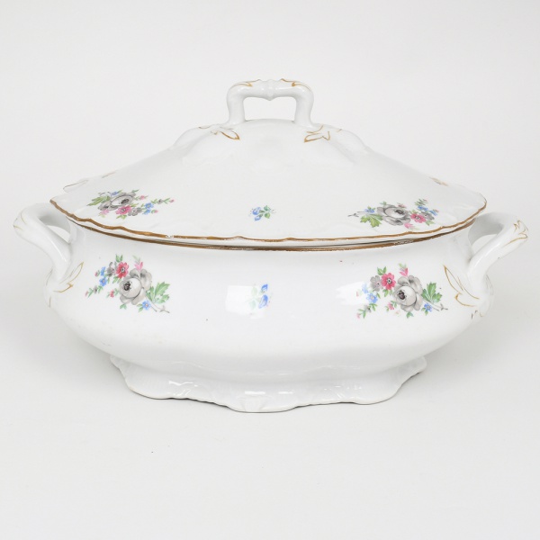 • Count Thun Porcelain Factory, Kláterec - República Tcheca(Fundada em 1794). Sopeira em porcelana esmaltada, de corpo ovalado e bojo abaulado, apoiada sobre base anelar recortada. Apresenta duas alças laterais integradas, de perfil curvo e vazado, acompanhando a linha do recipiente; tampa de perfil abaulado e borda ondulada, rematada por puxador central moldado em forma de alça vazada, com delicados acentos em douração. Possui ainda recorte lateral (entaille) destinado à passagem da concha de serviço. Decoração apresenta fundo branco com pequenos ramalhetes florais policromos distribuídos de maneira regular pelo corpo e pela tampa, compostos por flores em tons de cinza, rosa, azul e verde; ornamentação complementada por motivos estilizados em douração nas alças, bordas e relevos da tampa, além de filete dourado acompanhando o contorno ondulado da borda. Marca na base em verde: coroa sobre as iniciais TK e a inscrição Thun, manufatura da porcelana Thun, tradicional fábrica da Boêmia (atual República Tcheca). Medidas: Alt.: 18,5 x Comp.: 31,5 x Larg.: 23 cm. Apresenta pequena quebradura na borda da base, demanda pequeno restauro.