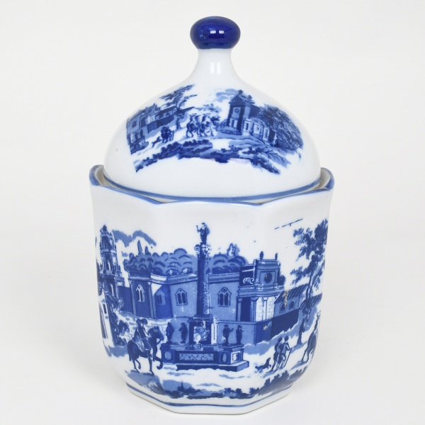 • Bombonière em porcelana azul-e-branco de inspiração Delft, corpo facetado, acompanhado de tampa abobadada encimada por pega elipsoide; decoração executada em azul monocromático sob esmalte, representando cenas paisagísticas com arquitetura, figuras humanas e elementos campestres, inspiradas na tradição decorativa das faianças holandesas de Delft, corpo apresenta painéis figurativos envolvendo edificações, colunatas e personagens em ambiente urbano e rural, enquanto a tampa repete a temática paisagística, borda realçada por filete azul. Peça decorativa ou utilitária destinada ao serviço de mesa, podendo funcionar como açucareiro ou bombonière. Medidas: Alt.: 20 x Diam.: 13 cm.