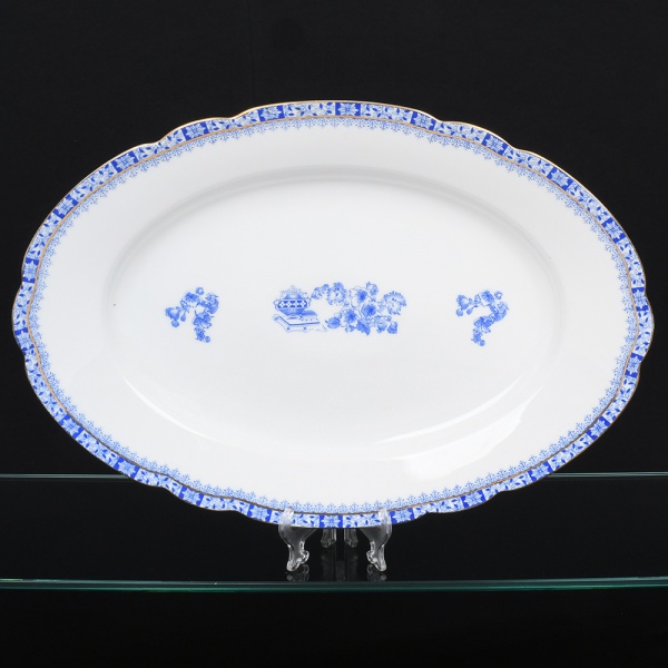 • ROSSLAU - ALEMANHA. Exuberante e grande travessa oval em porcelana alemã, de contorno recortado com aba larga levemente ondulada. Esmaltação branca, decoração apresenta composição em azul padrão china-blau, característica da tradição decorativa centro-europeia inspirada nas porcelanas orientais; aba ornada por friso contínuo em azul com motivos florais estilizados e elementos geométricos, delimitado por filete dourado acompanhando o contorno ondulado da borda, campo central apresenta vinheta decorativa em azul, composta por arranjo floral acompanhado de pequeno elemento ornamental representando ânfora sobre base. Marca na base em azul: CHINA-BLAU / ROSSLAU, indicando manufatura da fábrica Rosslau, Alemanha. Medidas: Comp.: 41,5 x Larg.: 28,5 cm.