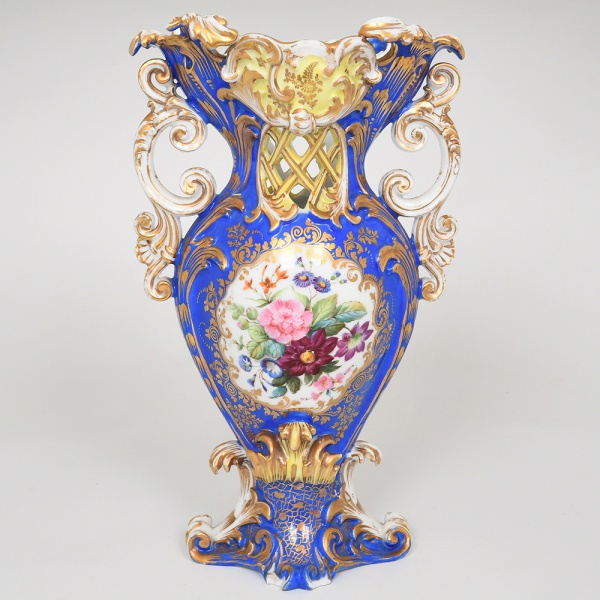 • Magnífico vaso ornamental em porcelana de pasta dura, produção parisiense (Vieux Paris), França, século XIX (c. 18401870), estilo Rococó revival (Luís XV). Executado em porcelana moldada, de bojo ovóide dilatado, assentando sobre base recortada de perfil contracurvado, com desenvolvimento ascensional para colo curto e garganta aberta, terminando em boca amplamente recortada em contorno ondulado (borda recortada e movimentada). Estrutura enriquecida por asas laterais vazadas, configuradas por volutas e contravolutas afrontadas, integradas ao corpo por apliques fitomórficos em relevo. A morfologia geral insere-se no vocabulário rocaille, com predominância de linhas sinuosas, assimetria compositiva, concheados, enrolamentos e folhas de acanto estilizadas, característicos do estilo Rococó revival (Luís XV), amplamente reinterpretado nas manufaturas parisienses do século XIX. Superfície integralmente revestida por esmalte azul cobalto de fundo (bleu de grand feu, de caráter imitativo do bleu de Sèvres), sobre o qual se dispõe extensa decoração em douração aplicada (or fin, overglaze gilding), organizada em arabescos, filetes, volutas e cartelas recortadas. O bojo apresenta, em ambas as faces, reservas centrais em cartelas assimétricas, contendo pintura policroma sobre esmalte (émail polychrome de petit feu) com composição floral naturalista (rosáceas e flores campestres), executada com modelado tonal e gradação cromática. Na zona superior frontal, insere-se cartela vazada com treliça (lattice openwork), elemento decorativo funcional que permite circulação de ar no interior da peça. A base apresenta campo decorativo com reticulado dourado e aplique central em relevo de feição vegetal estilizada. Interior integralmente esmaltado; base com reserva de pasta exposta, evidenciando marcas de apoio de queima. Ausência de marca de manufatura, condizente com a produção das oficinas independentes parisienses agrupadas sob a designação Vieux Paris. Medidas: Altura.: 31 x Comprimento.: 18 x Largura.: 12 cm.