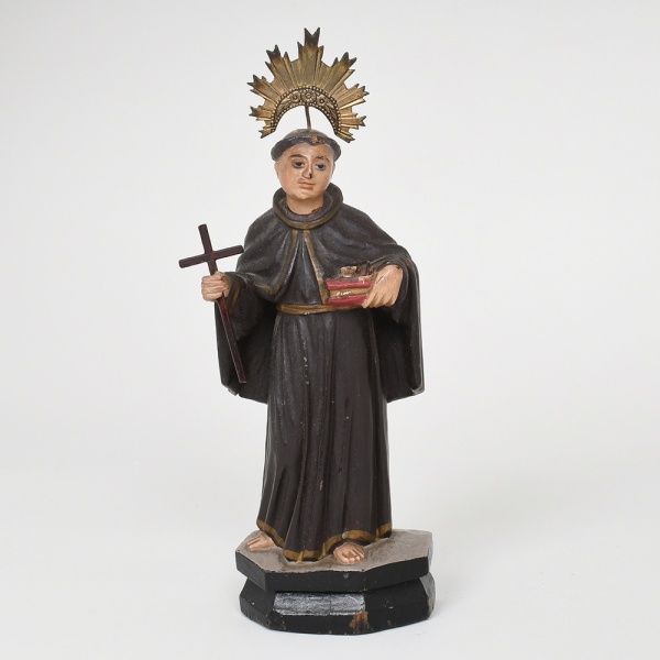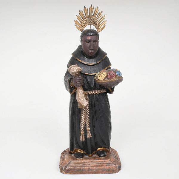 • ARTE SACRA. São Benedito das Rosas. Imagem devocional executada em madeira policromada.Apresenta-se de pé em posição frontal, trajando o hábito da Ordem Franciscana, com cordão de três nós à cintura, símbolo dos votos da ordem. Representado segurando pano não direita, enquanto na outra mão sustenta bandeja com rosas, atributo iconográfico associado ao milagre em que alimentos destinados aos pobres teriam sido transformados em flores, episódio tradicional da hagiografia de São Benedito. A cabeça é encimada por resplendor metálico dourado, fixado posteriormente à escultura. A policromia apresenta predominância de tons escuros no hábito, com detalhes dourados nos contornos, além de cores variadas nas rosas dispostas na bandeja, base retangular. Medidas: Alt.: 29,5 x Comp.: 13 x Larg.: 9,5 cm.