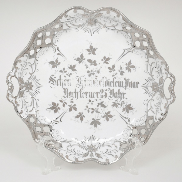 • Carl Tielsch, Silésia - Alemanha. Travessa em porcelana alemã, comemorativa de bodas de prata; esmaltação branca, de contorno lobado com bordas recortadas e vazadas, dotada de pequenas pegas laterais integradas, aba apresenta ornamentação em prata aplicada, composta por volutas, elementos vegetalistas estilizados e reservas vazadas, formando composição decorativa contínua de inspiração rocaille, campo central ornado por ramagens florais estilizadas em prata, envolvendo inscrição caligráfica em alemão executada em escrita gótica: "Seiner Silberhochzeit zum Tage den 28 Jahr". Marca da manufatura no verso. Medidas: Alt. 5 x Comp.: 31 x Larg.: 29 cm. Apresenta desgaste na escrita do centro, vide foto.