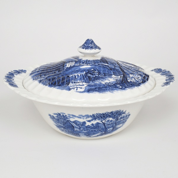 • Johnson Brothers, Staffordshire - Inglaterra(Fundada em 1883). Belíssima sopeira executada em faiança inglesa, padrão Watermill. Decoração monocromática em azul sob esmalte, representando paisagem rural com moinho hidráulico, executada por estampagem. A composição mostra edifício de moinho com roda dágua em funcionamento, pequeno dique e queda d'água, acompanhados por casas campestres, árvores frondosas, figuras humanas em ambiente bucólico e céu anuviado ao fundo; bojo de formato hemisférico, abas laterais integradas, orla e tampa modeladas com delicado movimento ondulado, borda recortada com arcos em repetição, puxador em forma de domo. Marca da manufatura no verso. Medidas: Alt.:  16 x Diam.: 29 cm. Apresenta leves manchas do tempo na parte interna.