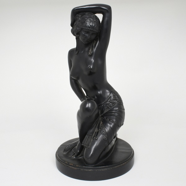 • Escultura decorativa representando figura feminina seminua em postura sinuosa, ajoelhada sobre uma das pernas e com o braço elevado sobre a cabeça, composição de forte caráter ornamental inspirada na estética Art Déco, apresenta tratamento estilizado das formas, com ênfase nas linhas curvas do corpo e na elegância do gesto, é representada com cabelos curtos ondulados e adorno de inspiração orientalista, usando apenas tecido drapeado envolvendo a região dos quadris, decorado com elementos geométricos e relevos que evocam motivos decorativos característicos do período entre-guerras. A superfície recebe acabamento em pátina de tonalidade preta uniforme, simulando bronze, assentada sobre base circular integrada, originalmente destinada à montagem como base de luminária ou elemento decorativo, evidenciada pelos orifícios presentes na base e no corpo da peça, destinados à passagem de fiação elétrica. Medidas: Alt.: 35 x Diam.: 18 cm. Apresenta pequenos desgastes na pátina em pontos isolados.