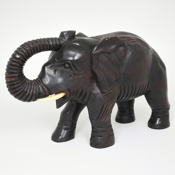 • Escultura animalista representando elefante, esculpida em bloco de madeira, com acabamento polido e tonalidade escura. Figura em posição de marcha, com tromba elevada e curvada, apresentando sulcos rítmicos ao longo da extensão, presas aplicadas em material sintético de coloração clara e olhos entalhados. Corpo com tratamento volumétrico simplificado, marcado por incisões lineares que sugerem textura da pele e definição anatômica das orelhas, membros e dorso. Medidas: Alt.: 23 x Comp.: 37 x Larg.: 12 cm.
