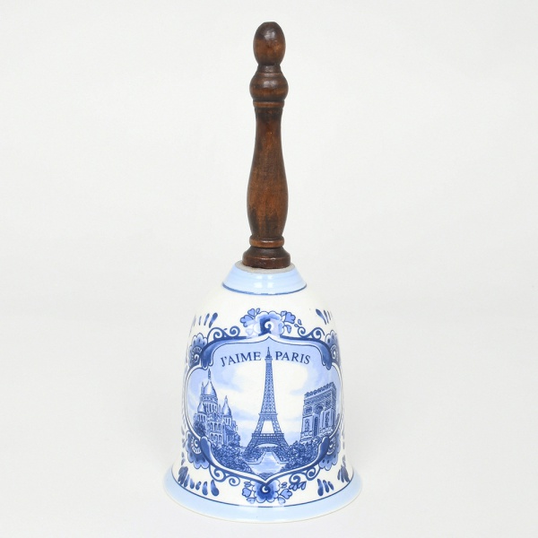 • Sino decorativo em porcelana holandesa de Delft, esmaltação branca decorada em azul monocromático, apresentando cabo torneado em madeira escura, corpo ornamentado com composição figurativa representando marcos arquitetônicos da cidade de Paris, incluindo a Eiffel Tower, o Arc de Triomphe e a Sacré-Cur Basilica, acompanhados da inscrição Jaime Paris, verso apresenta decoração floral estilizada em azul, inspirada na tradição do Delftware. Base marcada com o carimbo da manufatura. Apresenta pequena quebradura na borda. Medidas: Alt.: 19,5 x Diam.: 8,5 cm.