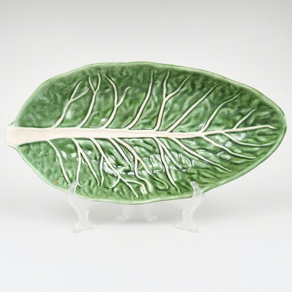 • Travessa oval executada em cerâmica modelada em formato de folha, de contorno alongado e borda elevada, interior côncavo apresentando nervura central em relevo e ramificações laterais estilizadas. Superfície esmaltada em tonalidade verde com variações cromáticas, com as nervuras ressaltadas em branco, configurando efeito naturalista. Base oval com marca em relevo NARA FP. Medidas: Alt.: 7 x Comp.: 39,5 x Larg.: 20 cm.