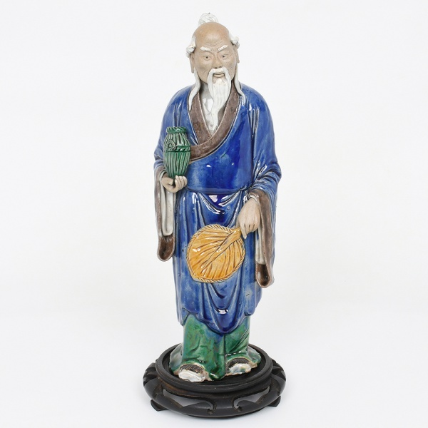 • Estatueta de sábio oriental em cerâmica chinesa esmaltada policroma, relacionada à tradição cerâmica de Shiwan. Figura escultórica representando ancião oriental de feições serenas, com cabeça parcialmente calva, longas sobrancelhas e barba fluente, trajando amplas vestes tradicionais, segura pequeno vaso na mão diireita e leque na mão esquerda, atributos associados a personagens da tradição filosófica e simbólica chinesa, frequentemente vinculados à ideia de sabedoria, contemplação e longevidade, sendo tipologicamente relacionada às representações do imortal taoista Shou Xing, divindade da longevidade na cultura chinesa. A modelagem apresenta tratamento expressivo do rosto e das vestes, com pregas bem definidas e cuidadoso detalhamento das feições. A peça é revestida por esmaltação vítrea, predominando azul intenso nas vestes, complementado por tons verdes na parte inferior, marrom no forro das mangas, amarelo no leque e esmalte claro na barba e cabelos, combinação cromática característica das figuras inspiradas na tradição cerâmica de Shiwan, conhecida pela produção de esculturas de sábios, imortais e personagens da cultura chinesa.Base circular em madeira entalhada. Marcada ao fundo  CHINA, indicando produção chinesa destinada à exportação. Medidas: Alt.: 29 x Comp.: 14 x Larg.: 11 cm.