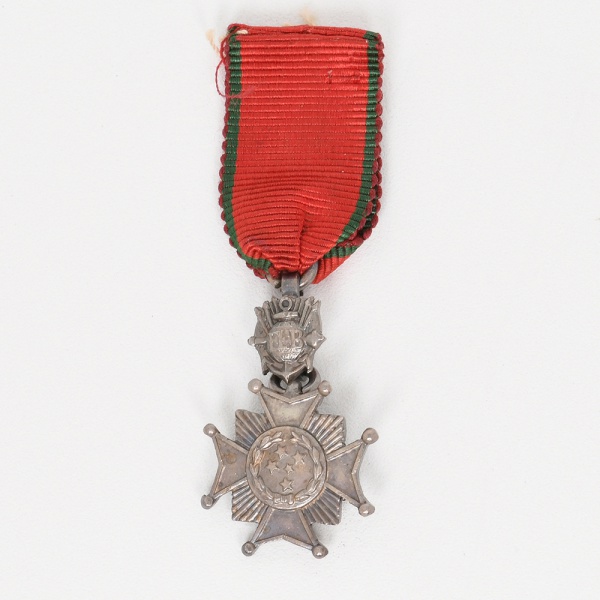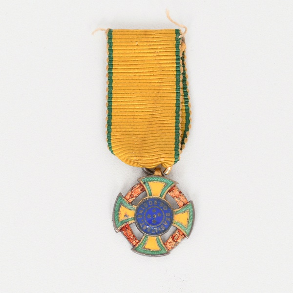 • Medalha de Guerra  1942. Executada em prata. Insígnia constituída por cruz de braços iguais esmaltados nas cores verde e amarelo, intercalados por ramos estilizados em esmalte vermelho. Ao centro, medalhão circular esmaltado em azul com inscrição REPÚBLICA DOS ESTADOS UNIDOS DO BRASIL e estrelas em campo central. Reverso com inscrição: MEDALHA DE GUERRA  22-VIII-1942. Suspensa por argola a fita de gorgorão amarela com frisos verdes laterais. Estado conforme fotografias. Medidas: Medalha: Diam.: 1,5 cm. Comp.: 4,5 cm.