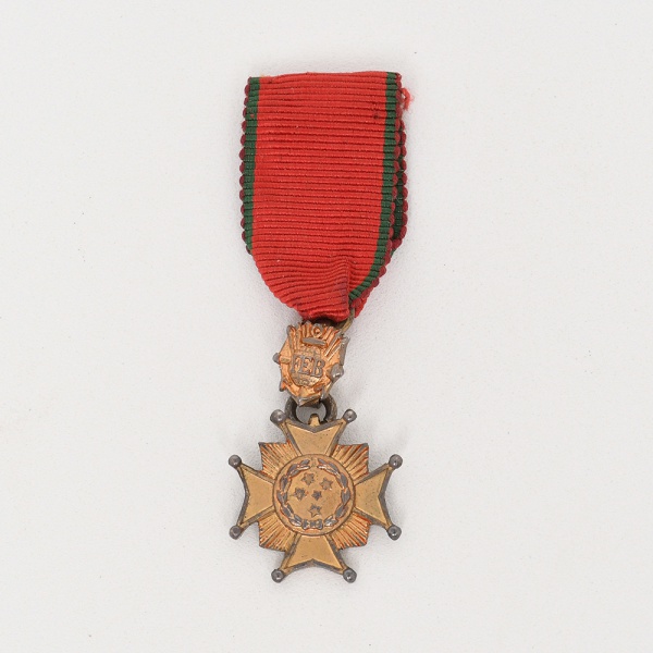 • Cruz de Combate  1ª Classe  Força Expedicionária Brasileira (FEB). Executada em prata com vermeil. Insígnia constituída por cruz pátea de quatro braços com extremidades arredondadas, sobreposta a feixe de raios. Ao centro, medalhão circular com estrelas em relevo circundadas por coroa. Suspensa por elo intermediário com emblema contendo as iniciais FEB. Reverso com inscrição: ESTADOS UNIDOS DO BRASIL  CRUZ DE COMBATE  1ª CLASSE. Fixação por argola a fita de gorgorão vermelha com frisos verdes laterais. Executada em prata. Medidas: Medalha: Diam.: 1,5 cm. Comp.: 5 cm.